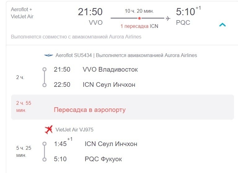 Прямые авиарейсы из Владивостока в Фукуок не осуществляются. До этого острова можно добраться только с пересадкой. Ее сделайте, например, в Сеуле. Вот один из вариантов.