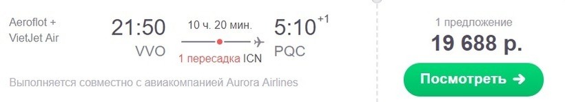 На дорогу у вас уйдет почти десять с половиной часов. Рейсы выполняют авиакомпании Aeroflot совместно с Aurora Airlines и VietJet Air.