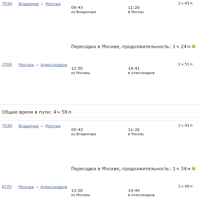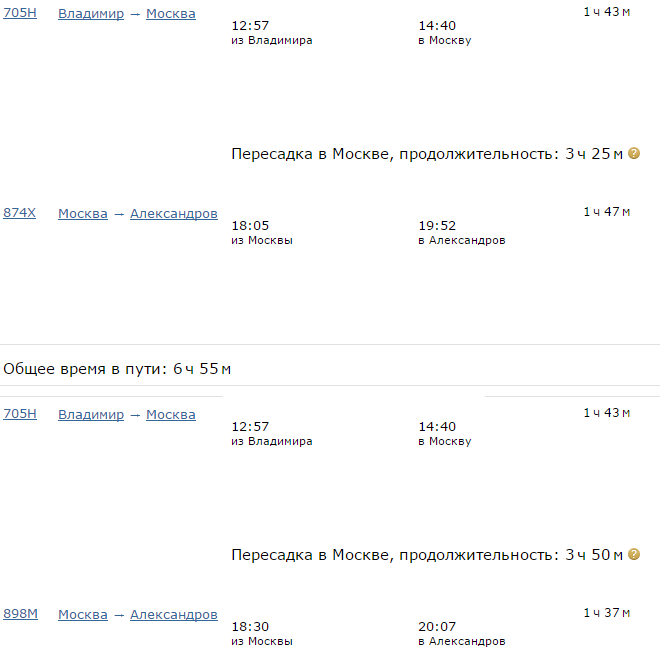 Ниже приведена информация о том, сколько часов вам потребуется, чтобы добраться от Владимира до Александрова, а также приведена примерная стоимость проезда (средняя цена билета) на том или ином виде транспорта.