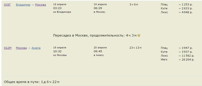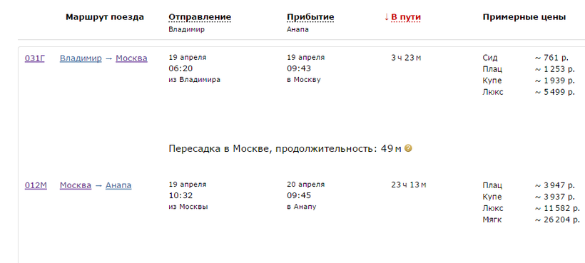 Хочу заметить, что прибывают поезда из Владимира на Ярославский вокзал. Но не следует пугаться, что за 49 минут вы не успеете пересесть на свой рейс. Казанский и Ярославский вокзалы находятся рядом на Комсомольской площади, идти придется по подземному переходу метров 400. Но если вы хотите, чтобы для пересадки было больше времени в запасе, тогда воспользуйтесь вариантом, приведенным ниже.