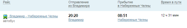 Данный маршрут обслуживает только один перевозчик, курсирует один автобус. Отправляется рейс в 20.20 из Владимира. В Набережные Челны прибывает в 08.51. Ехать им удобно еще и потому, что вечером выезжаешь, а утром уже в нужном городе.