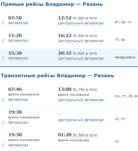 Расписание автобусных рейсов по направлению Владимир - Рязань