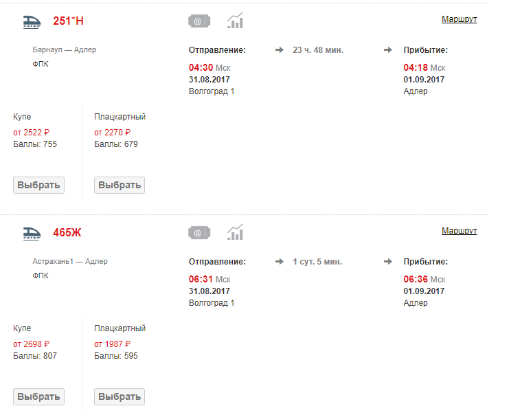 На поезде нужно будет сначала добраться до Адлера. Отъезд осуществляется с ж/д вокзала Волгоград-1, расположенного по адресу Привокзальная площадь, 1. Также на некоторые поезда можно сесть на станции Сарепта, что очень удобно для жителей Красноармейского района.