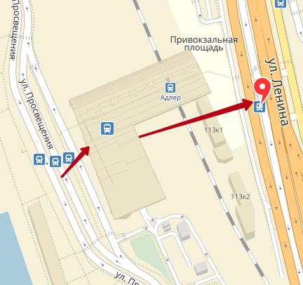 Выходим на последней станции - Адлер. Отсюда уже рукой подать до Пицунды. Проходим к остановке, как показано на рисунке, и садимся на автобус №117, 1265, 57 или 100 и за 25 р. доезжаем до Псоу - время в пути минут 30. Также можно проехать и на такси, но стоить это будет недешево и зависит от наглости таксиста и от Вашего умения договариваться). Далее, пройдя границу, на маршрутке доезжаем до Пицунды (см. на самолете).