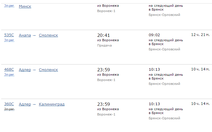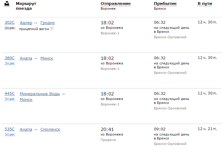 Билет на любой транзитный поезд, который идет через Воронеж и Брянск, вы можете купить: