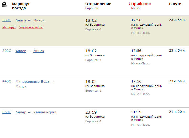 По такому маршруту курсирует 4 поезда, идущие из курортных российских городов в Минск. Однако ходят не каждый день, а по определенным датам, которые предварительно следует обязательно уточнить при покупке билетов.