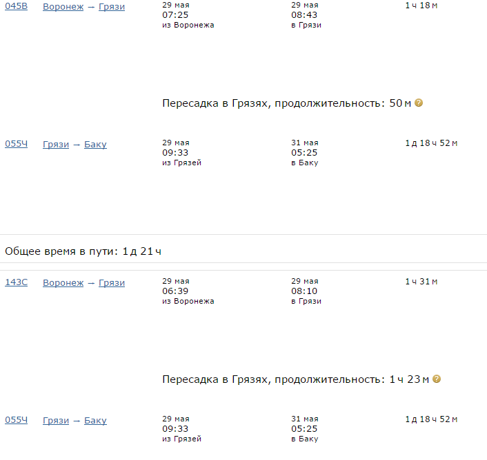 Ниже приведена информация о том, сколько часов вам потребуется, чтобы добраться от Воронежа до Баку, а также приведена примерная стоимость проезда (средняя цена билета) на том или ином виде транспорта.