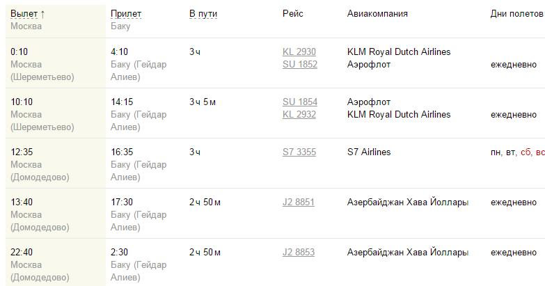 Из Москвы из разных аэропортов улетают следующие самолеты в Баку: