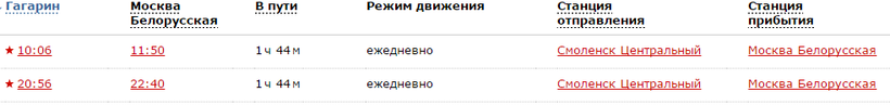 По данному маршруту курсирует две электрички маршрута Смоленск - Москва, идут они через Гагарин - одна отправляется утром в 10.06, вторая - в 20.56.