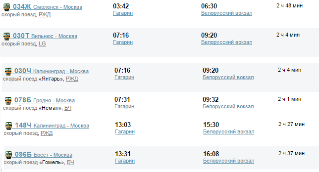 Также доехать можно и на пассажирском поезде, которые идут транзитом через Гагарин. РЖД предлагает нам с вами целых шесть вариантов скоростных поездов, которые в большинстве случаев идут с разных белорусских городов или Калининграда.