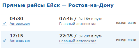 Это самый дешевый вид транспорта по направлению «Ейск – Ростов-на-Дону». Поедка обойдется приблизительно в 360 рублей с человека, правда в случае провоза багажа придется заплатить за него 32 рубля.