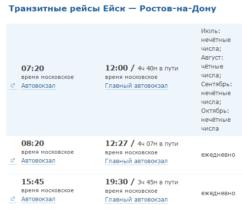 В данном направлении ходят 5 рейсов, в том числе прямые и транзитные. Их расписание приведено ниже.