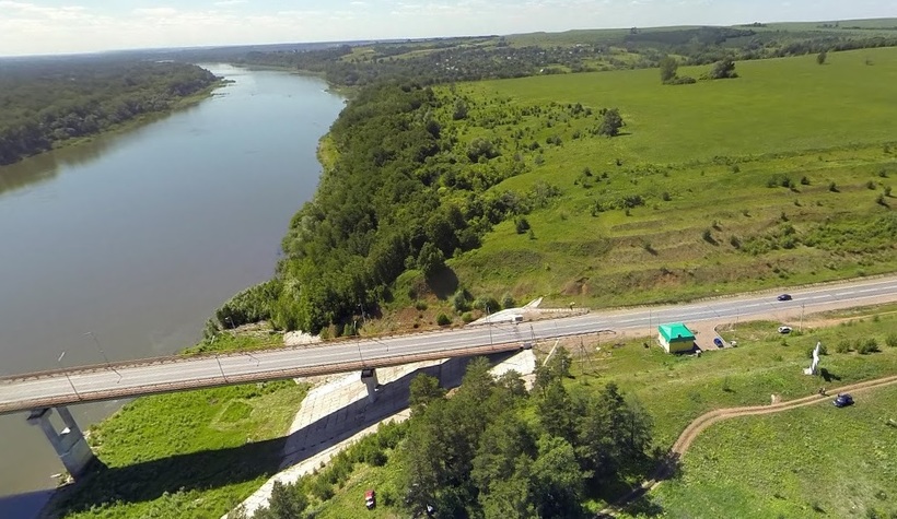 Теперь глаз радует окружающий пейзаж. Под Дмитровкой, недалеко от Уфы, притормозил, увидев водителя, запускающего квадрокоптер. На флешку сбросил мне вид трассы с высоты птичьего полета. Виден мост через реку Белая.