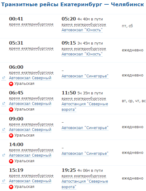 Автобусы по транспортному сообщению между Екатеринбургом и Челябинском курсируют с утра до ночи, перерыв существует только между 01.00 - 05.00.