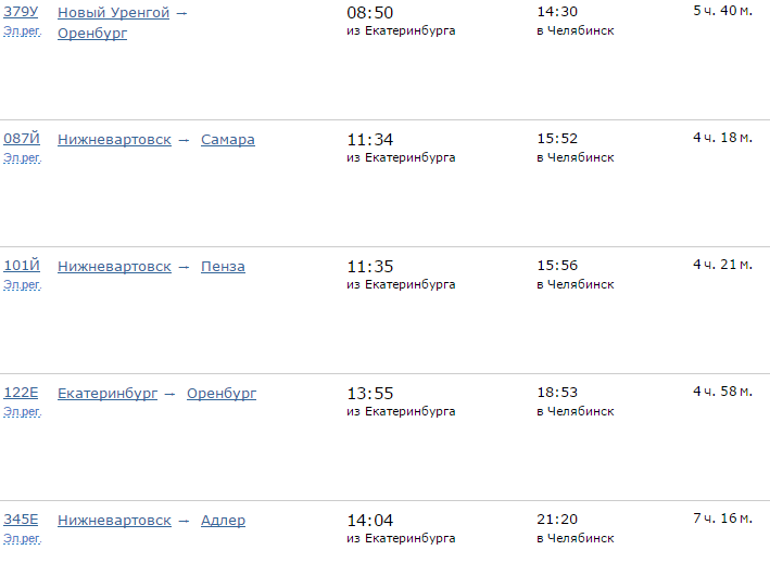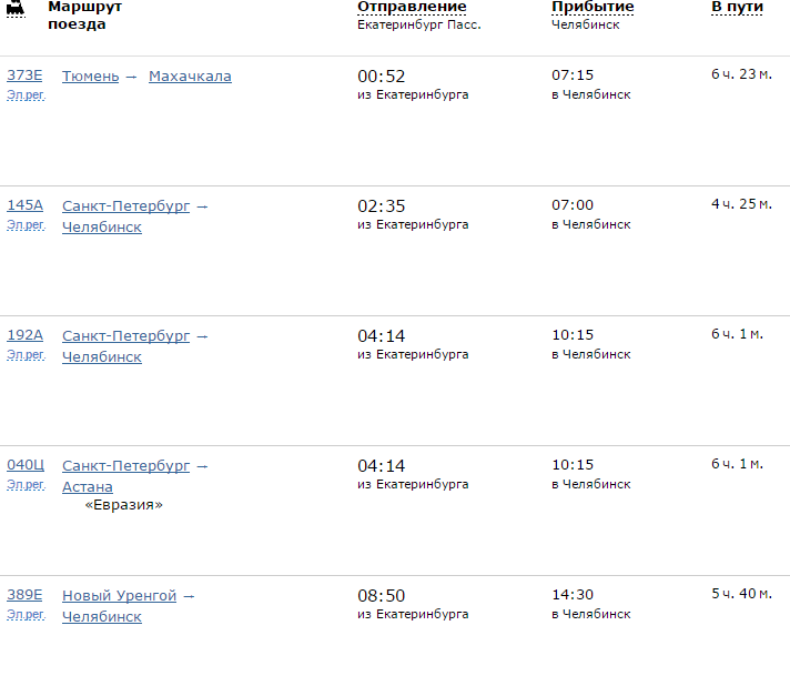 Все поезда в направлении Челябинска отправляются со станции Екатеринбург-Пассажирский, прибытие на главный челябинский железнодорожный вокзал.