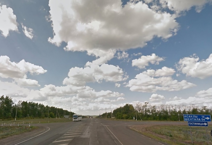 Теперь остается придерживаться М5, идущей на Хлебодаровку, Кандрыкуль, Октябрьский. Вот затяжной спуск в Октябрьский. Дальше пойдет равнинная местность.
