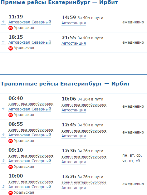 По маршруту из Екатеринбурга в Ирбит курсирует ряд прямых и соответственно транзитных автобусов, что проходят через данные города и делают небольшую остановку на автостанциях.