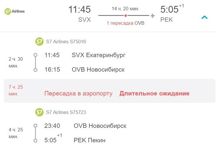 В дороге проведете почти четырнадцать с половиной часов. Оба рейса выполняет российская компания S7.