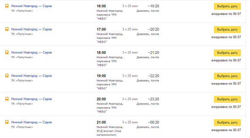 На рейсовый автобус с автовокзала вы не успеете, потому что ходят они в Дивеево до 17:10. Но от ТЦ «Метро» вплоть до поздней ночи отправляются маршрутки из Нижнего Новгорода в Саров, на них вы сможете добраться до места.