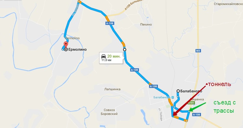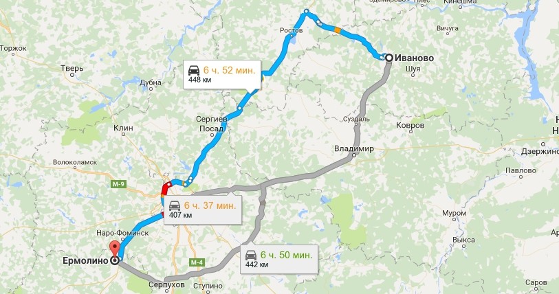 Второй вариант пути, но он более удачный, в том плане, что меньше пробок - это ехать по трассе М7 до съезда на шоссе А108, далее двигаться по этой дороге до Киевского шоссе, ехать до развязки, далее маршрут описал выше. Общее расстояние 440 км, среднее время в пути 7 ч.