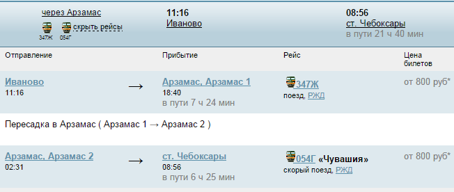 Если выберете для поездки из Иваново в Чебоксары железнодорожный транспорт, потребуется сделать пересадку. Самый короткий путь – через Арзамас, займет он 21 час 40 минут, остальные варианты еще дольше. Для этого сядьте в Иванове на поезда в сторону Уфы или Самары, которые чередуются. Доехав, до Арзамаса-1 потребуется пересесть на автобус № 1 и проехать до вокзала «Арзамас-2», думаю, кондуктор подскажет, где нужно выходить. Там потребуется подождать поезд «Чувашия».