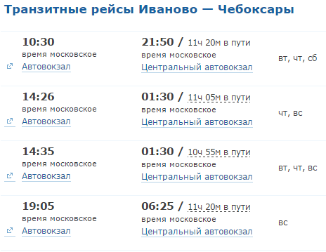Такой вариант мне нравится, он очень удобен. Есть прямой ежедневный рейс до Чебоксар, отправляется он из Иваново в 7 часов 45 минут, прибывает в 19 часов 15 минут. На поездку уходит 11,5 часов, это дольше, чем на автомобиле, но в дороге можно поспать, а останавливается автобус на крупных станциях примерно раз час – полтора. Имеются еще транзитные рейсы, бывающие в определенные дни, но в более позднее время суток. Их расписание привожу ниже.