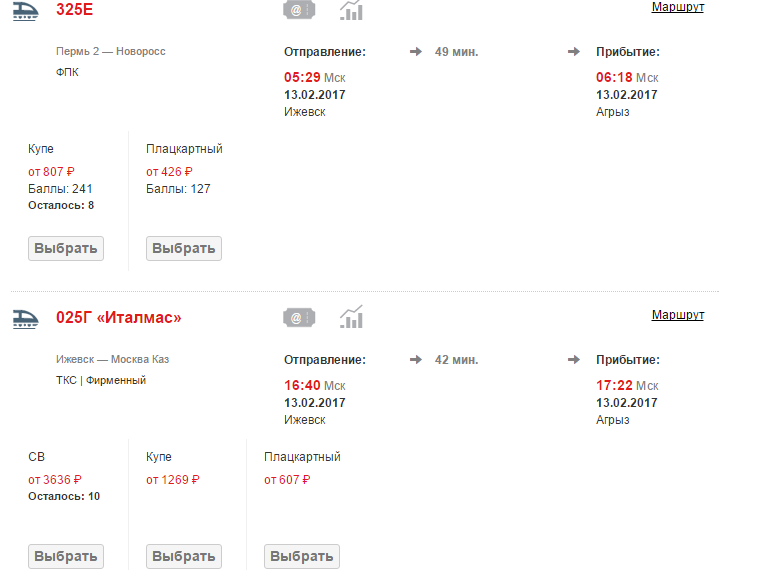 К примеру, на завтра, 13.02.17, найдено 2 поезда, идущих через Агрыз.