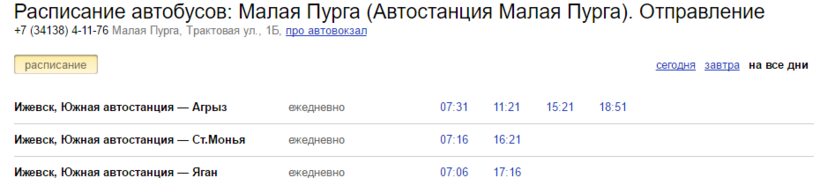 Еще один вариант, как можно добраться прямым маршрутом до нашего пункта "Б" - ежедневные рейсы на автобусе. Подойдет тем, у кого нет собственного авто, или ранним пташкам. Рейсы стартуют с Южного автовокзала в Ижевске аж с 6 утра, поэтому уже в 7 часов можно быть в Малой Пурге. Я сделала скриншот автобусов, которые идут интересующим нас маршрутом.