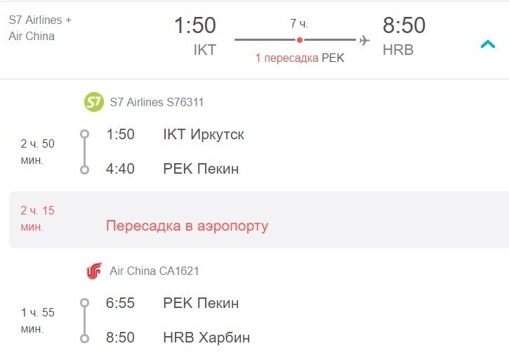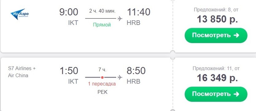 Рейс выполняет компания IrAero. В небе нужно провести два часа и сорок минут. В остальные дни до Харбина вы можете добраться с пересадкой, например, в Пекине.