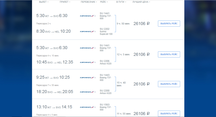 На мой взгляд, самым простым вариантом будет вот такой. Вылет в 9:55 из Иркутска компанией «Аэрофлот», а посадка в Шереметьево в 11:05, в полете придется провести 6 часов 10 минут. Дальше в 12:50 вылет из того же Шереметьево, а посадка в Хельсинки в 13:30, время в небе - 1 час 40 минут. Общее время перелета составляет 9 часов 35 минут. А вообще, подбирайте удобное для себя время вылета и прилета. А еще, советую не забывать при выборе рейса о том, что разницу во времени между Иркутском и обеими столицей еще никто не отменял. :) А то у меня сразу как-то не складывалось количество часов между вылетом и прилетом.
