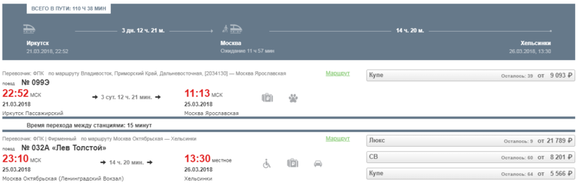 Самым лучшим вариантом будет поезд Владивосток — Москва, но не фирменный, а обычный, он значительно дешевле. Отправляется он в 22:52 из Иркутска, а прибывает на Ярославский вокзал в 11:13, в пути придется провести 3 дня 12 часов. Далее нужно долго подождать или погулять по столице. :) В 23:10 отправление фирменного поезда Лев Толстой в Хельсинки. Прибытие в конечную точку запланировано на 13:30, в пути — около 15 часов.