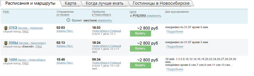 Цена на билет в один конец составляет около 2800 рублей. Отправляется поезд от вокзала Казань-Пасс, пункт назначения: вокзал Новосибирск-Главный.