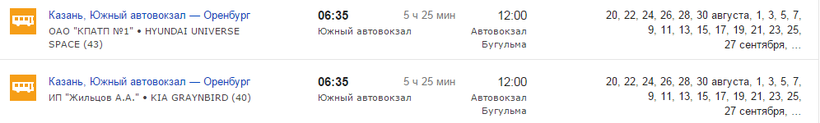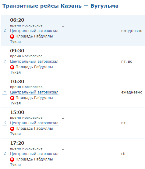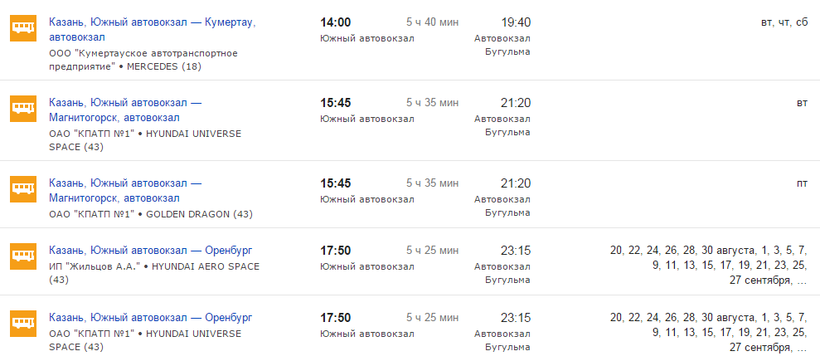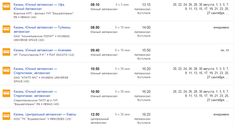 Зато автобусы в Бугульму отправляются сразу с 2 казанских автовокзалов: Южного и Центрального. Первые рейсы есть уже рано утром в 6 часов 20 минут, но ближе к 18 часам в этот город уходят последние автобусы. С Центрального автовокзала есть всего 2 ежедневных маршрута, и оба они – утренние, остальные рейсы возможны только в выходные дни и пятницу.