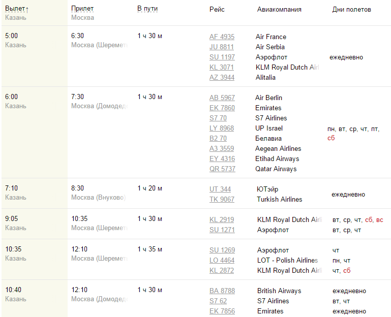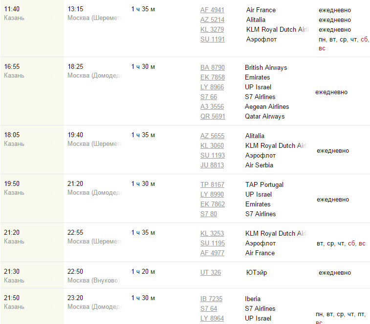 Из Казани в столицу можно добраться следующими авиа рейсами: