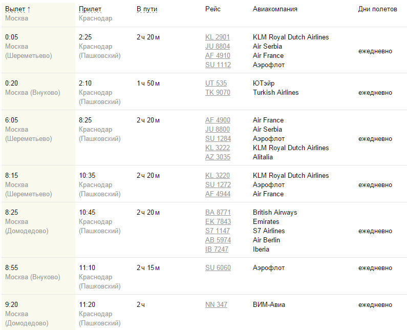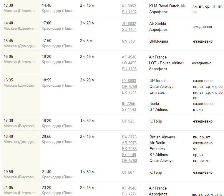 Из Москвы в Краснодар летают такие авиа рейсы: