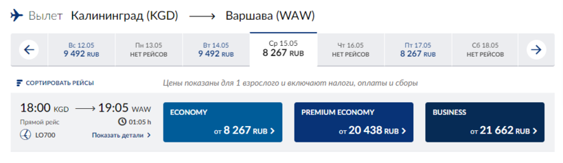 Простой и быстрый способ. Самолеты из аэропорта Калининграда «Храброво» в варшавский аэропорт имени Фридерика Шопена летают, так сказать, целыми стаями. :) Но увы, большинство из них делают пересадку в Москве (жуткие глупости, на мой взгляд). Одна авиакомпания LOT молодец, у них есть прямой рейс. Но увы, рейсы не ежедневные, надо отслеживать расписание на сайте. Вот фрагмент полетов на май.