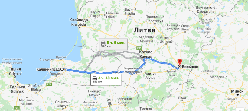 Калининград — Вильнюс — маршрут на карте