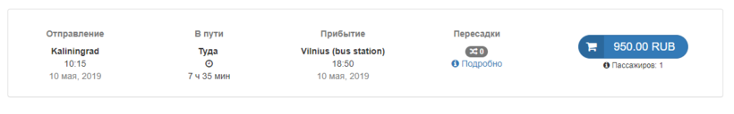 Ниже приведена информация о том, сколько часов вам потребуется, чтобы добраться от Калининграда до Вильнюса, а также приведена примерная стоимость проезда (средняя цена билета) на том или ином виде транспорта.