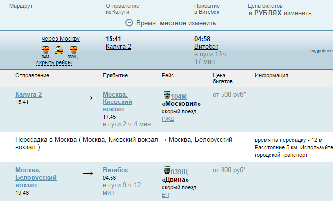 1) Калуга - Москва - Витебск и затратите 13 ч 17 мин;
