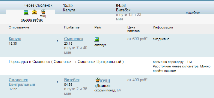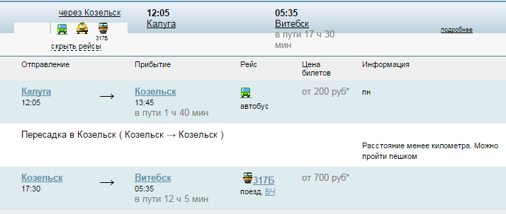 3) Калуга - Козельск - Витебск самый долгий 17 ч 30 мин.
