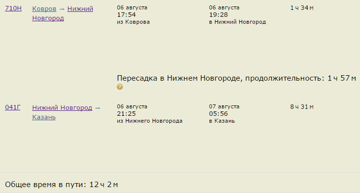 Из Коврова прямых поездов в Казань нет. Ездим всегда через Нижний Новгород. Таких вариантов много, но мы выбираем такой, чтобы ночь провести в пути, а утром прибыть на место. Приведу наиболее подходящие маршруты.