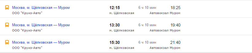 Из Коломны можно проехать в Муром на автобусе, но только сделав пересадку в Москве. Мне этот вариант нравится меньше всего, потому что прибывают все рейсы к столичной станции метро Котельники, а отправляются в нужном направлении с Щелковской автостанции, на которую потребуется добираться, сделав 2 пересадки. Это крайне неудобно. Автовокзал в Коломне называется Голутвин, от него автобусы до станции метро Котельники отправляются ежедневно с 04:25 минут до 20:00 с небольшим интервалом в 5–10 минут. За 1 час 40 минут вы доберетесь до места, после чего вам предстоит проехать не менее часа на метро до Щелковской автостанции, откуда ходят рейсы в Муром. С их расписанием можете ознакомиться ниже.