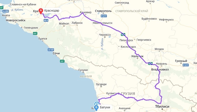 Краснодар — Батуми — маршрут на карте