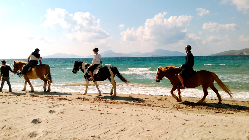 - На Косе можно покататься на лошадках. Час катания по пляжу будет стоить около 25-30 Eur с человека. Здесь можно будет заказать разного рода покатушки: в ночное время, в воде (искупаться вместе с лошадью), на закате или рассвете – но всё это будет стоить чуть дороже, чем просто покататься верхом днём. Вот места, в которых можно заказать это развлечение: Horse Riding Family Farm недалеко от городов Тигаки и Мармари, Salt Lake Stables в городе Мармари, Erika's Horse Farm тоже в городе Мармари, Rafaels Trail Riding в городе Кардамена. Если вы остановитесь в каком-то другом городе, а покататься на коняшках хочется – не расстраивайтесь. Эти компании предлагают услугу трансфера от отеля.