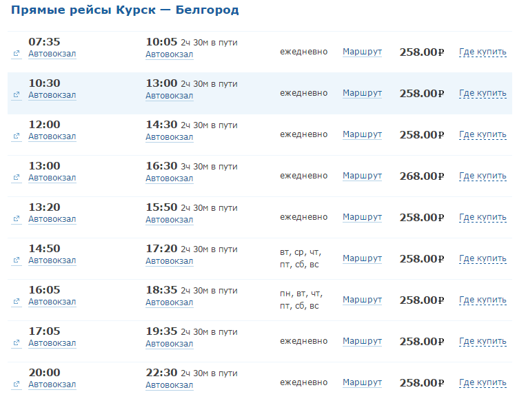 Если вам по каким-либо причинам не подошли вышеупомянутые варианты, всегда существует возможность воспользоваться автобусом, который курсирует по этому маршруту ежедневно, начиная с 07:35 и заканчивая 20:00. Отправление любого из этих маршрутов, происходит с курского автовокзала, на территории которого вам и нужно будет предварительно приобрести билеты. Кстати, если вы не успеете на прямой рейс, курсирующий по данному направлению, всегда уместно пересесть на транзит, который как мне известно, направляется в Белгород рано утром, примерно в 4 и 5 утра.