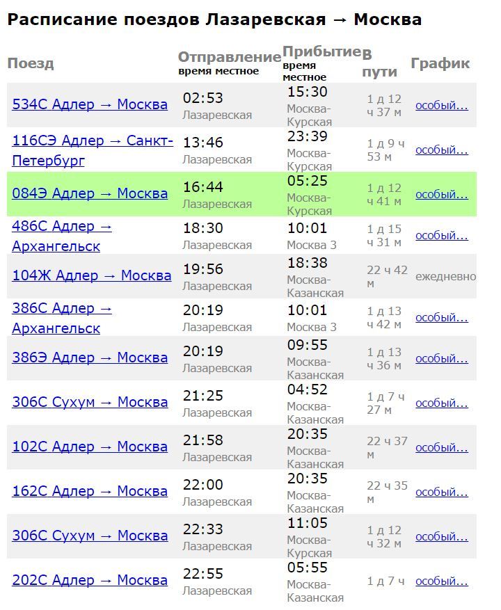Все поезда на Москву ходят со станции «Лазаревская». Билеты лучше покупать заранее, хотя бы за неделю до планируемой поездки. Прямых поездов с Лазаревского, к сожалению, нет. Все рейсы – проходящие (12 штук). Быстрее всего добраться можно поездом 162С Адлер Москва-Казанская ( в пути 22 ч 35 мин). В среднем, каждый поезд делает 24 остановки за всё время. Прибывают поезда на такие вокзалы: Москва-Казанская, Москва-Курская, Москва-3. Стоимость билетов будет зависеть от даты их приобретения. В среднем, плацкарт обойдётся вам от 2500 рублей, купе - от 5000 рублей, СВ – от 10500 рублей.