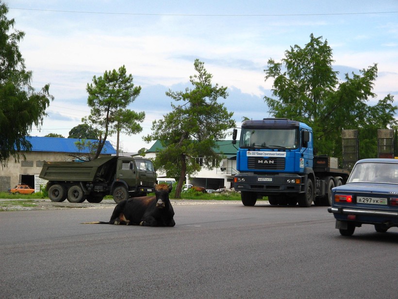На территории России вас еще будут сопровождать многочисленные камеры фиксации скоростного режима, да и сами сотрудники ГИБДД будут то и дело мелькать на дорогах, а вот в Абхазии с этим дела обстоят более проще. Там нет ни камер, ни стационарных постов ГИБДД. О чем говорить, если в этой стране коровы спокойно разгуливают прямо по дорогам, не пугаясь проезжающих мимо машин? :)