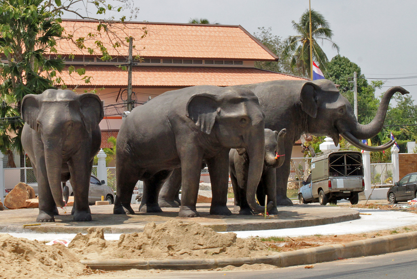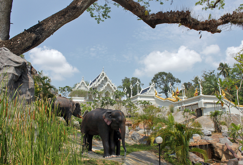 Скульптурные изображения различных животных: слоны, тигры, птицы.