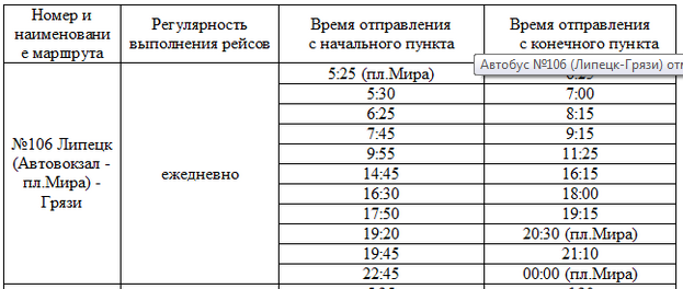 Автобусы из Липецка часто ходят в Грязи. Если решили отправиться на этом виде транспорта, тогда вам нужен рейс под № 106. Привожу примерное его расписание, но его следует уточнить перед поездкой, потому что оно временами изменяется.