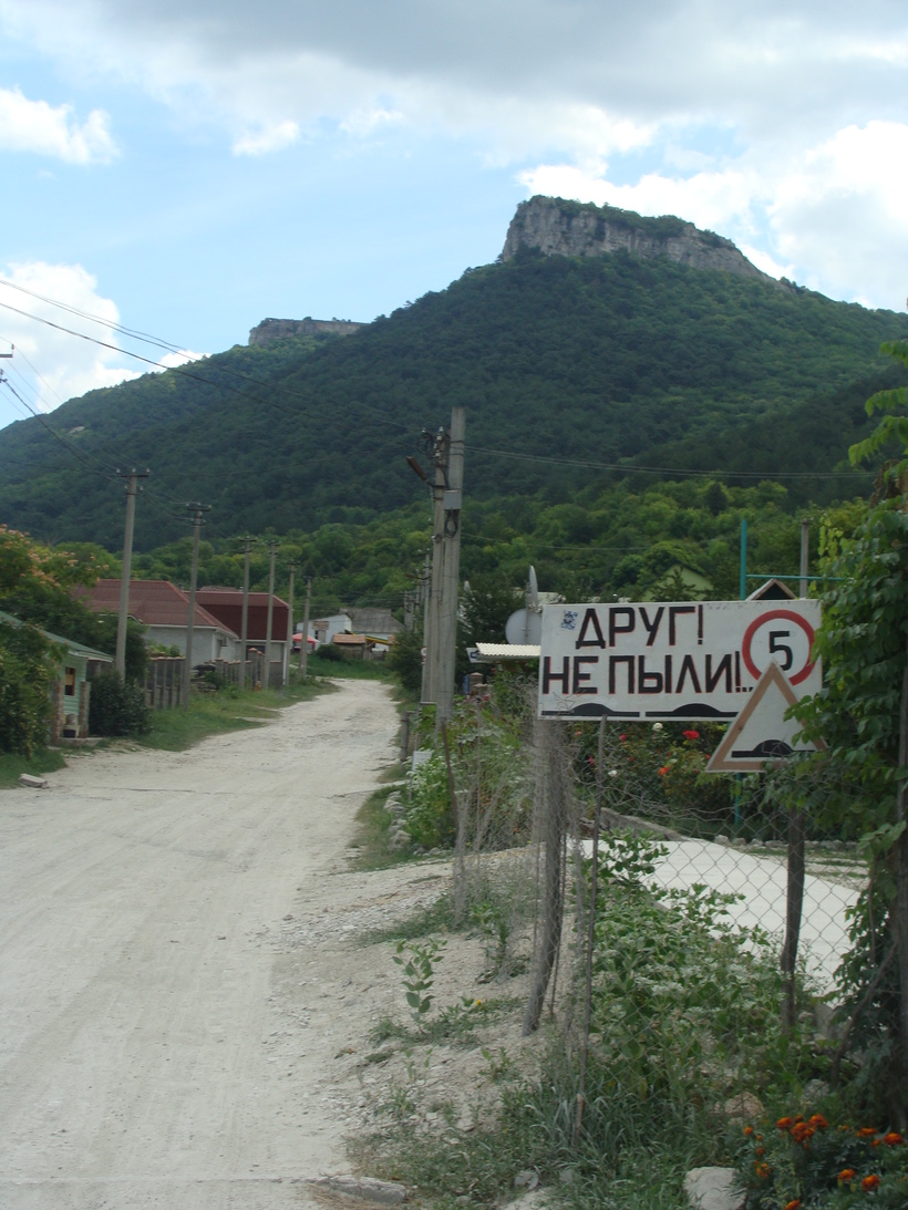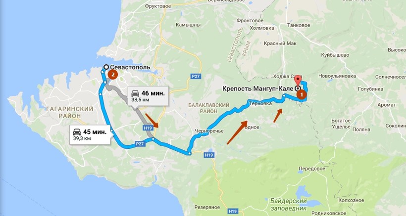 Мы ездим к Мангупу (1) на машине, например, от Севастополя(2).